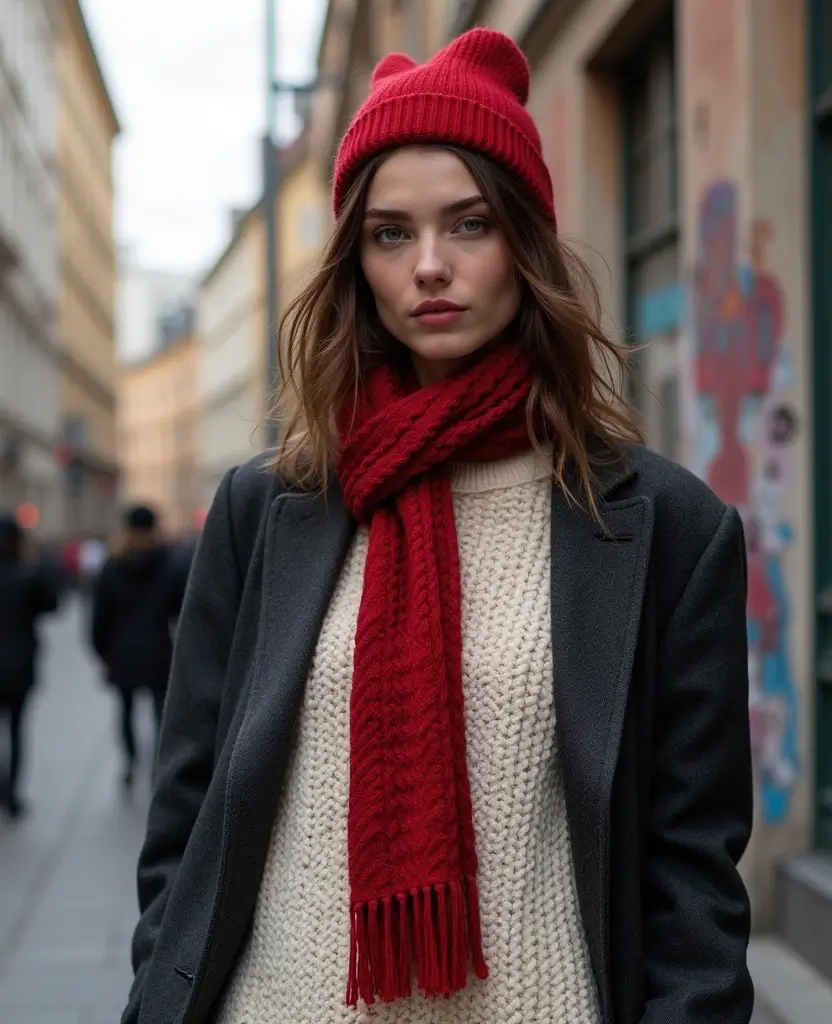 It’s a perfect way to introduce a splash of brightness while also keeping warm. Pair it with neutral tones to keep the look sophisticated and chic.