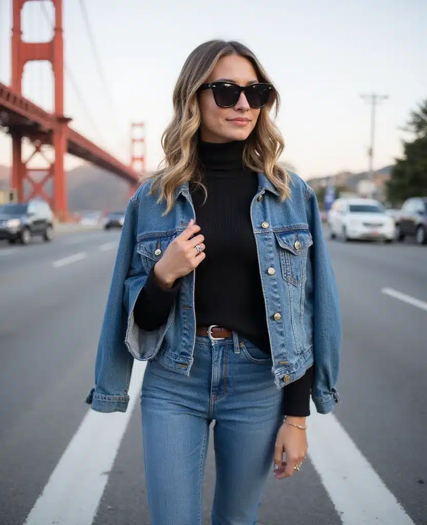 Picture a lightweight turtleneck peeking out from under a stylish denim jacket, paired with high-waisted jeans.