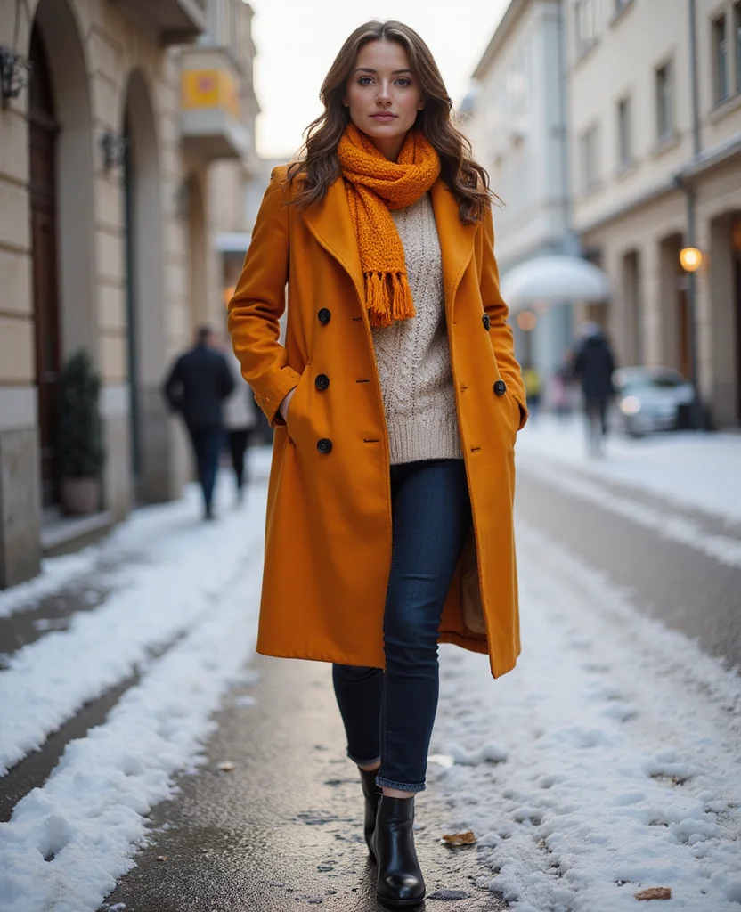 A chunky knit scarf in a contrasting color adds warmth while keeping the outfit visually interesting.